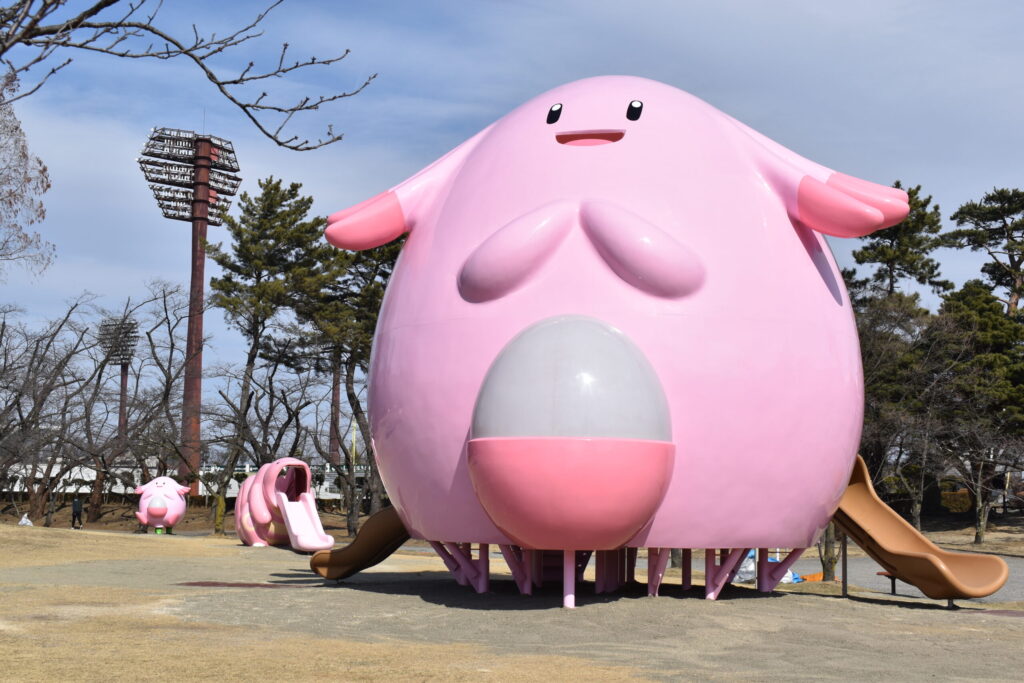 You can’t miss the towering 6-meter-tall pink Chansey play structure as you walk through Koriyama’s Kaiseizan Park. This cheerful image of the Chansey Pokemon is one of several play structures created for the pleasure of small children in collaboration with Fukushima Prefecture and Pokemon Local Acts. Besides the giant Chansey with its twin slides, you’ll find a swing set with several Pokemon perched on top, a swinging structure featuring Cleffa and Igglybuff, and a toddler slide created from Lickitung’s tongue.