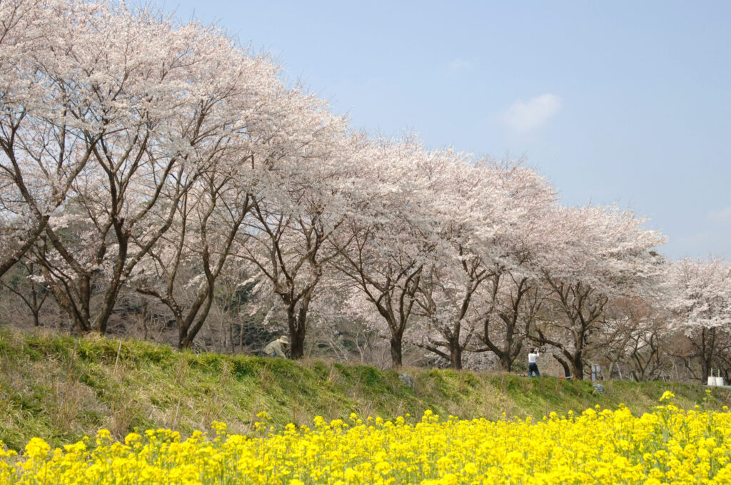 In the past, this area was covered with rice paddies, but in recent decades the inner riverside has become lined with a colorful spectrum of seasonal flora: Yoshino cherry blossoms and yellow rapeseed blossoms in spring, purple hydrangeas and pink lotus flowers in summer, magenta cosmos in autumn, and even pale Japanese apricot in winter. But Kinchakuda is most famous for its spectacular carpet of crimson “manjushage” red spider lilies in early autumn, which are best viewed from mid-September through early October.