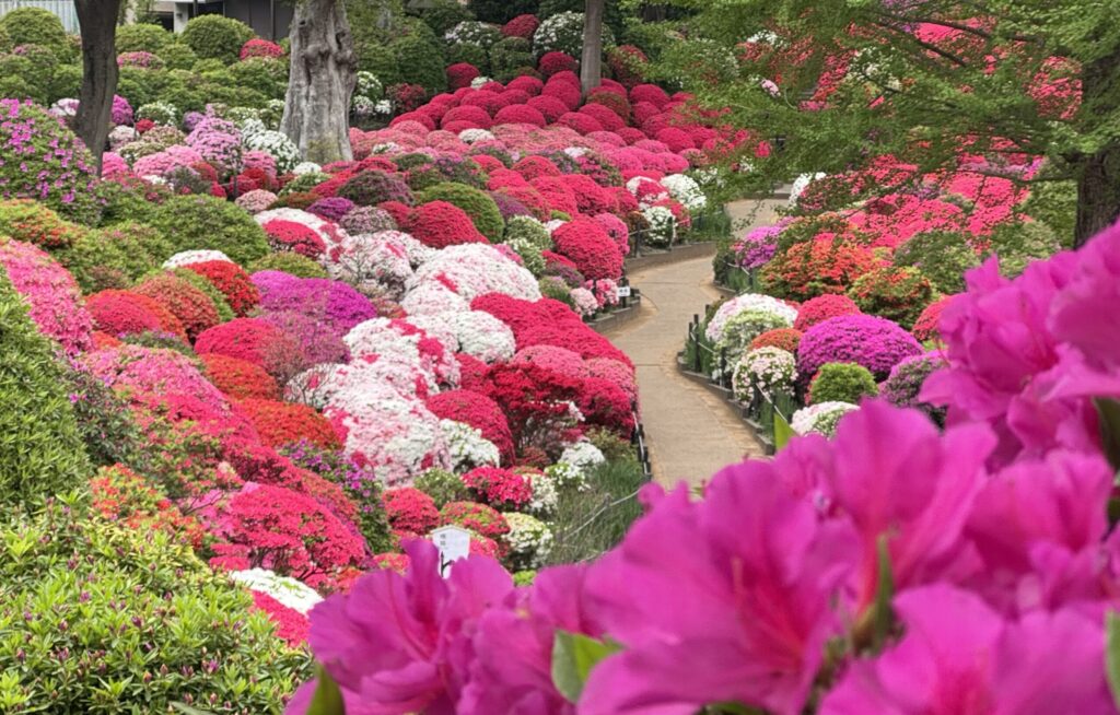 A timeless Edo shrine surrounded by thousands of blooming azaleas