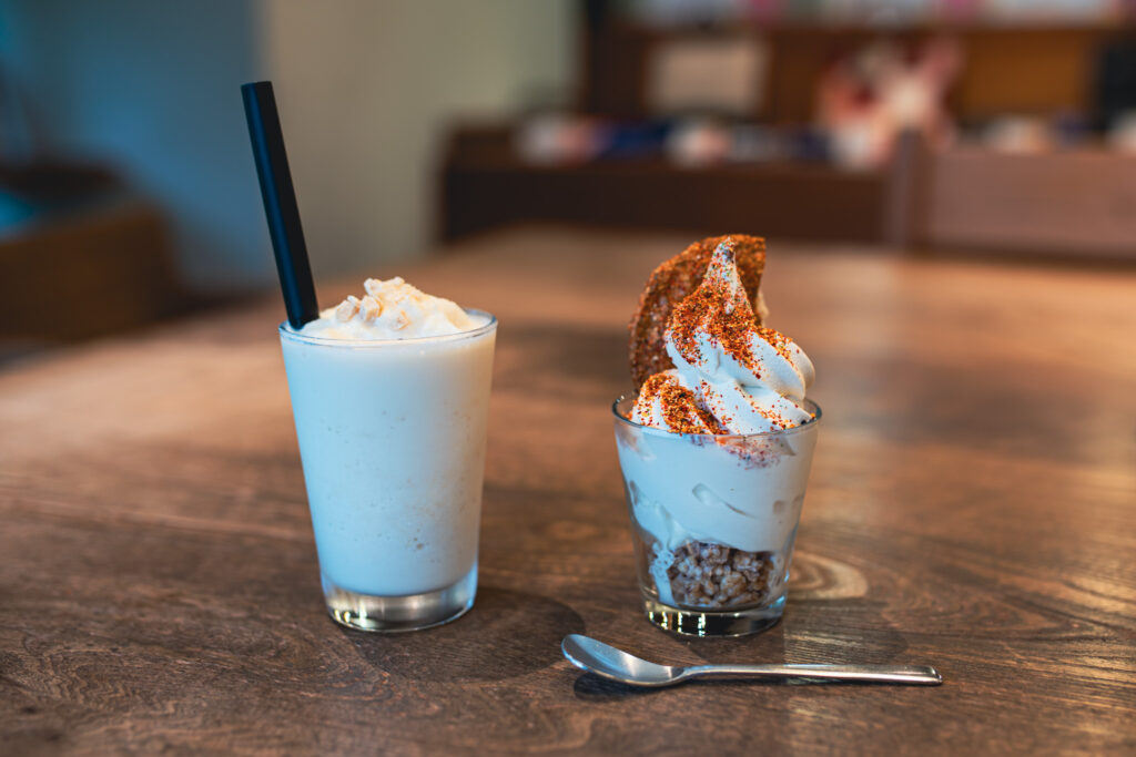 After your workshop experience, relax in the garden café, surrounded by seasonal greenery that earned the facility an award from the city for its splendid scenery. The café's creative menu puts unique spins on traditional ingredients: try the Soka senbei soft-serve ice cream, donuts, senbei-based dashi udon noodles, or the healthy meat-free senbei burger. For drinks, sample juice made with locally grown komatsuna (Japanese mustard spinach), carefully brewed coffee and tea, or apple juice straight from Aomori prefecture.