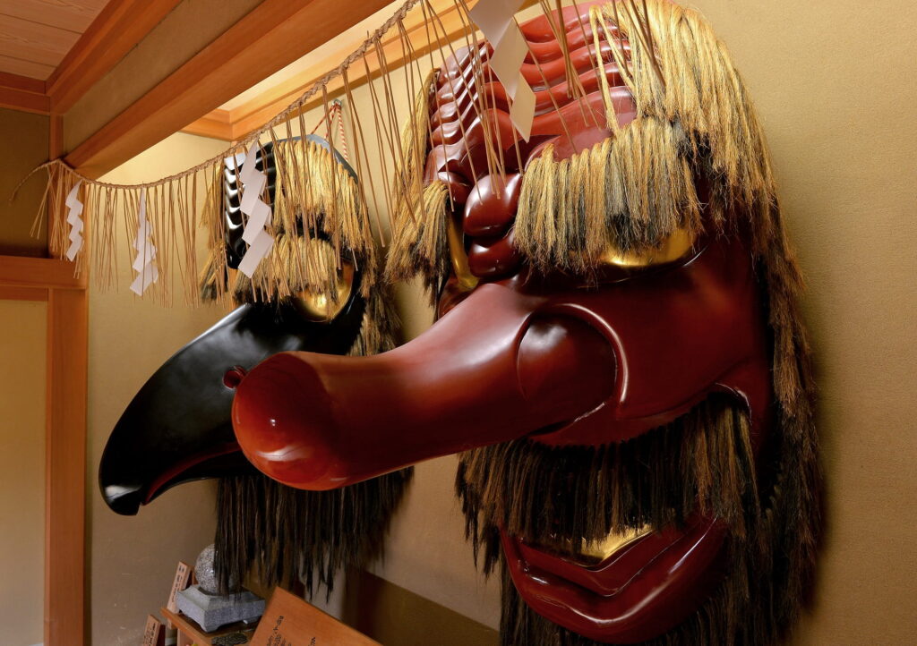 Wander around the shrine grounds and into the shaden, or main building, and you'll find a large collection of around 200 masks resembling goblins called tengu. According to Japanese folk tales, these fearsome, long-nosed creatures are legendary figures that boast magical powers to ward off disasters and protect people from bad luck. Because tengu are supposedly enshrined in Furumine Shrine, many visit to pray for good luck, safe travels, bountiful harvests, protection from fire, and good health.